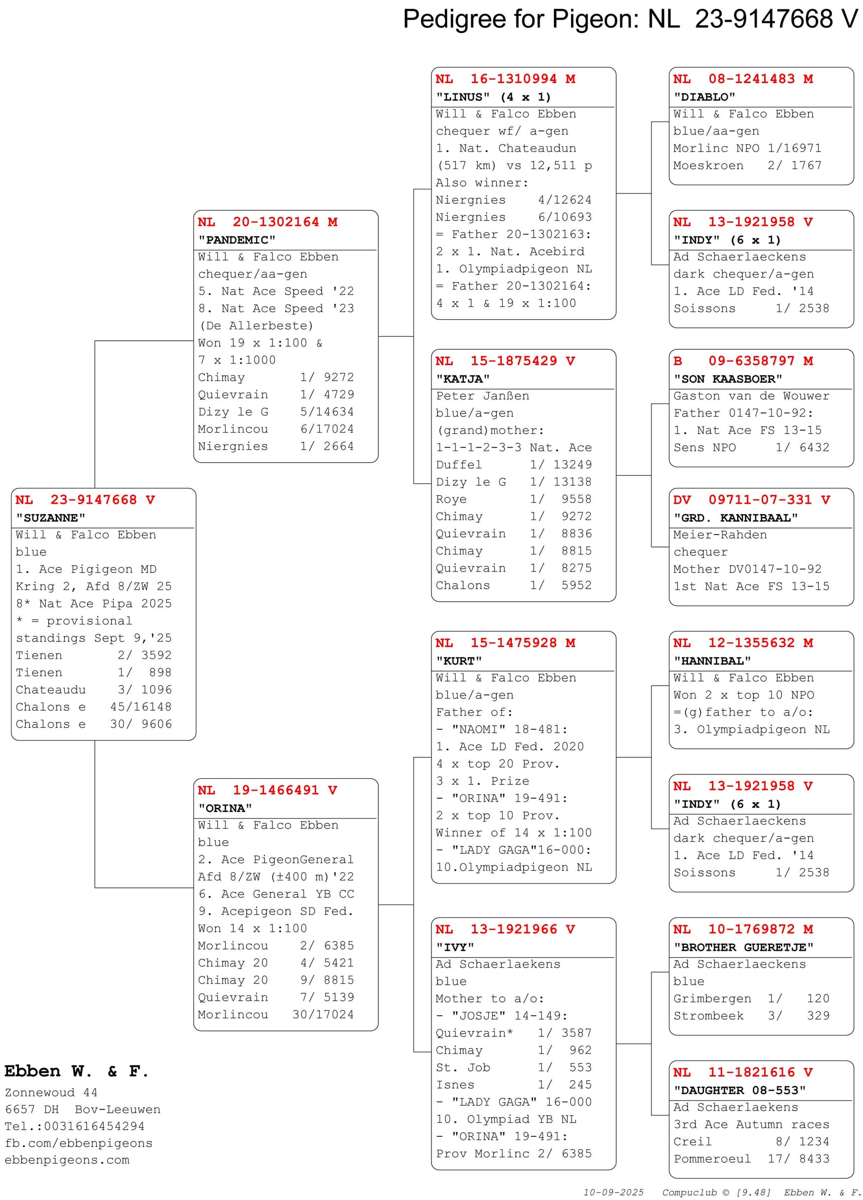 Dé ster van dit jaar. Stond begin september 8e in de PIPA Ranking Allround. Won 7x 1/100 en werd asduif midfond in de kring. Afkomstig van “Pandemic” x “Orina” (samen goed voor 33x 1/100).