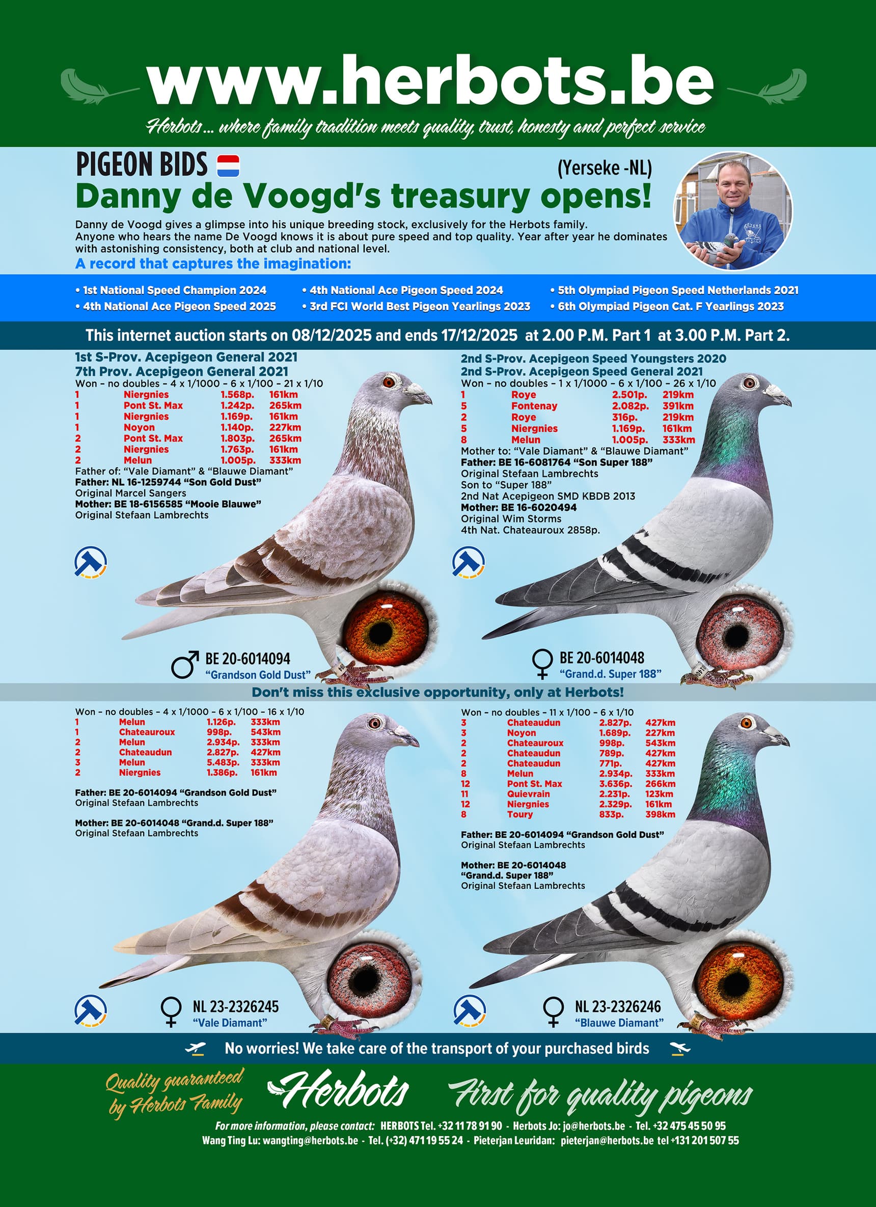 Danny de Voogd geeft exclusief voor de familie Herbots een kijkje in zijn unieke kweekbestand. Wie de naam De Voogd hoort, weet dat het om pure snelheid en topkwaliteit gaat. Jaar na jaar domineert hij met verbazingwekkende consistentie, zowel op club- als op nationaal niveau.