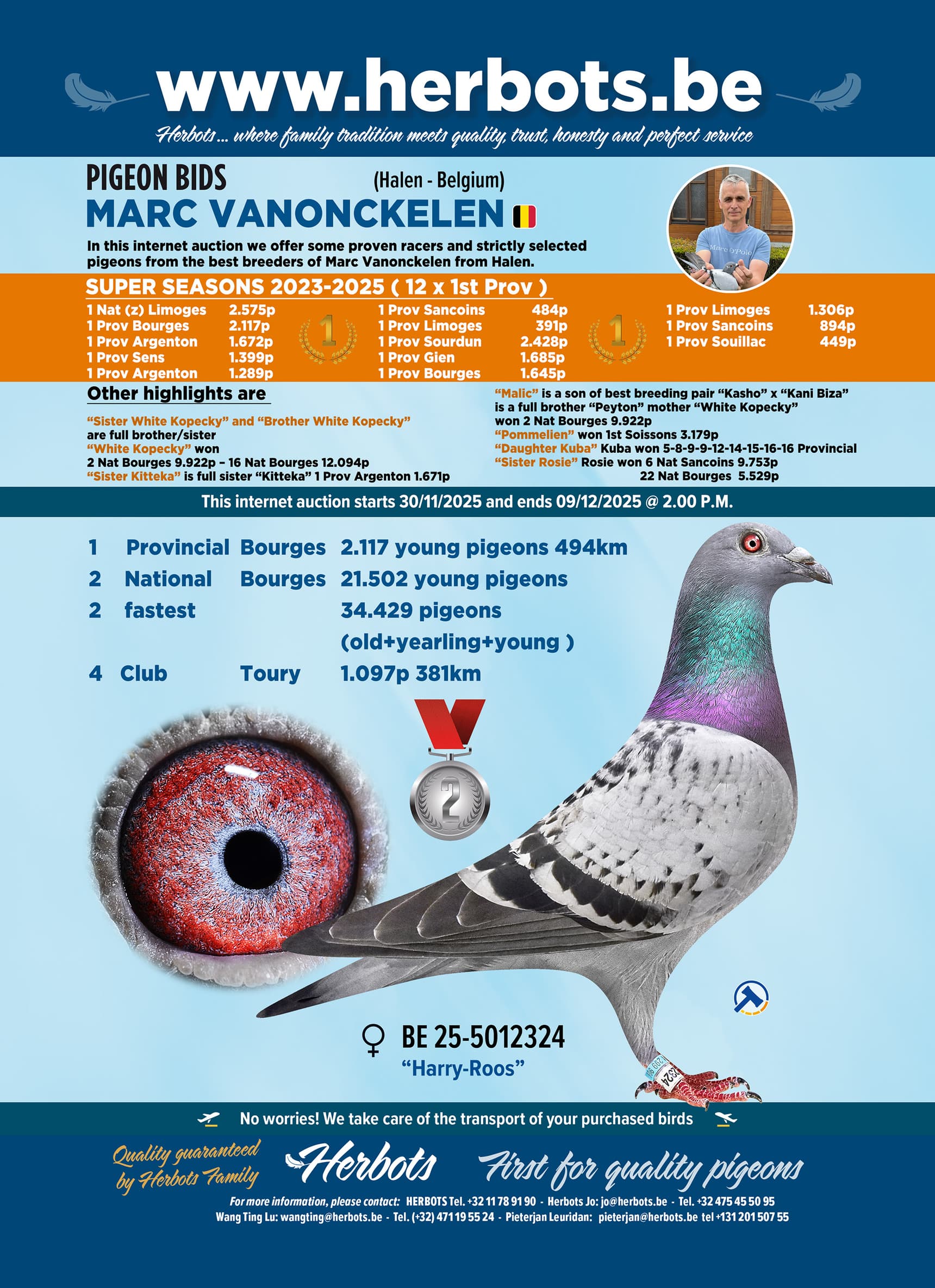 In deze speciale veiling superster "Harry-Roos" 2de NATIONAAL BOURGES WINNAAR 21.502 JONGE DUIVEN 2025