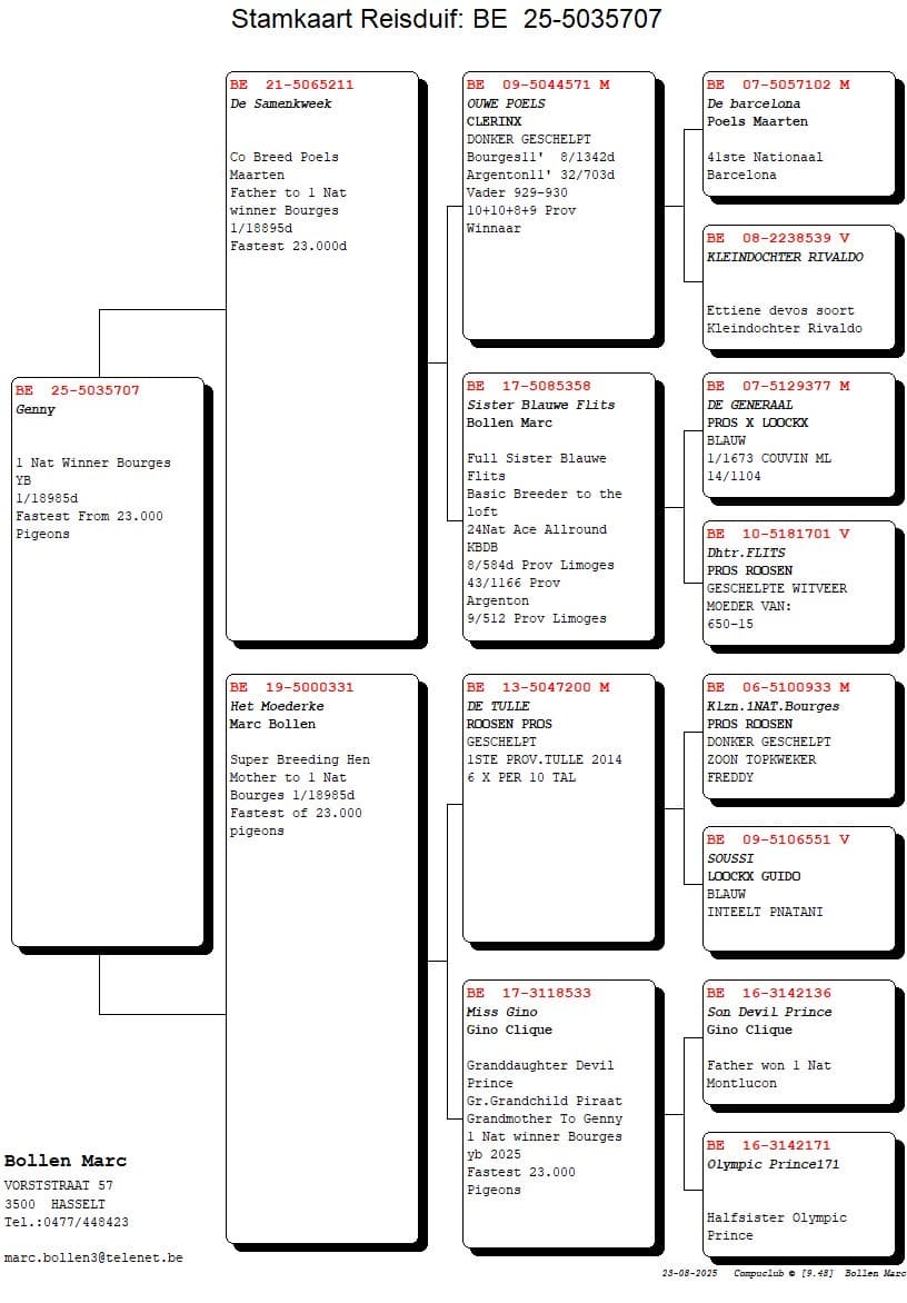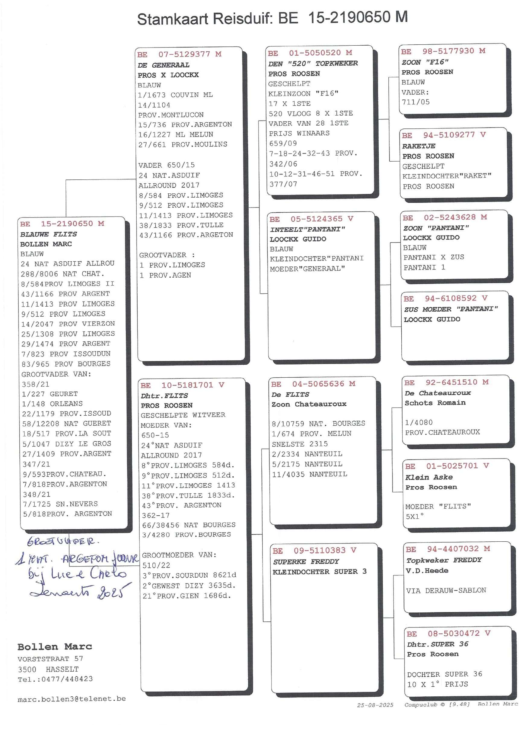 “De vader is de basiskweker 650-15, een superduif die zelf geweldig gevlogen heeft en 24ste Nationaal Asduif KBDB Allround werd,” legt Marc uit. “De moeder is een zus van 650-15. Die lijn loopt trouwens door in topprestaties, want 650-15 is ook grootvader van de 1ste Nationaal Argenton 2025 bij Carlo Lenaerts.”