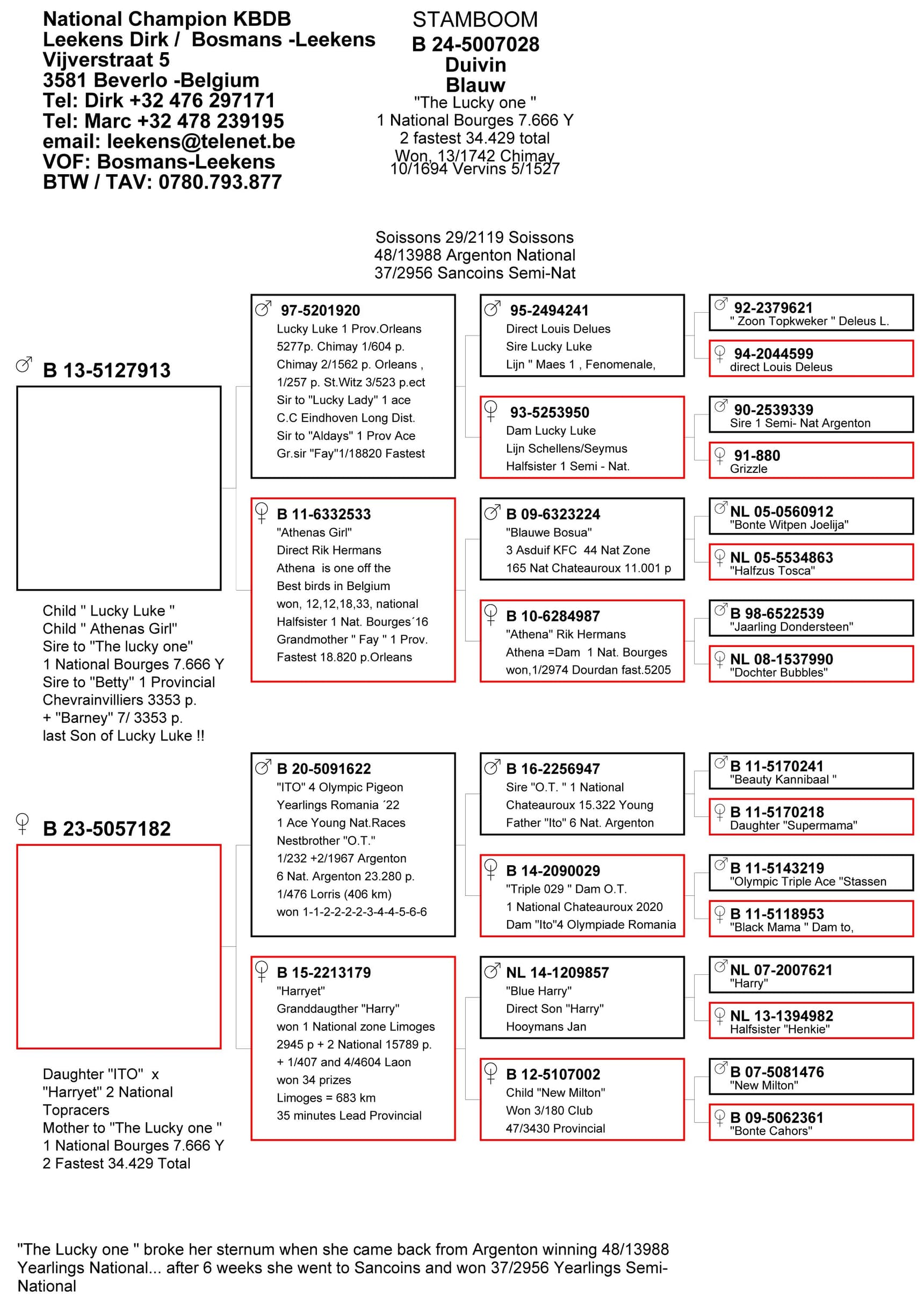 Haar vader is een zoon van “Lucky Luke”, de stamvader van het hok Bosmans-Leekens, gekruist met de unieke “Athena” lijn va Rik Hermans