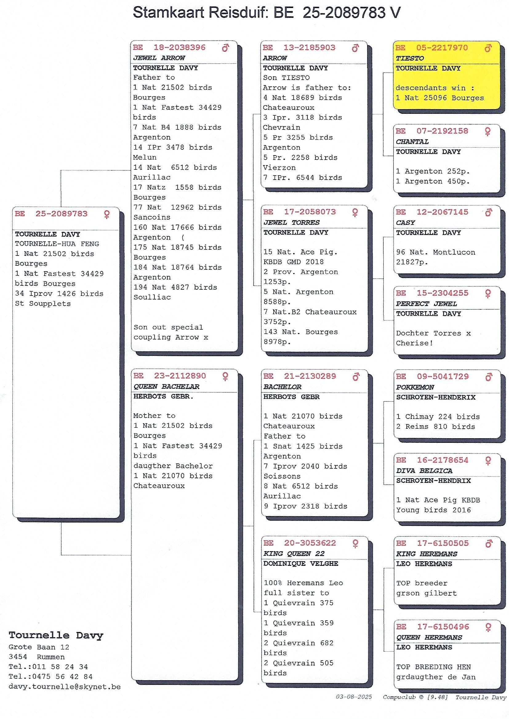 Het seizoen is met 350 jonge duiven gestart en toen de laatste jonge duif ingekorfd was voor Bourges duidde het PAS systeem 271 jongen aan. Als je het mij vraagt vind ik dat Davy geen al te grote verliezen kende. “Maar” repliceert Davy “Bourges is hun eerste massa lossing en dan is het toch steeds met een klein hartje de duiven opwachten”. Op maandag waren er 200 thuis en Davy hoopt op nog een 20-tal “nakomers” en dan wordt het aantal verliezen als “normaal” bestempeld. Over “nakomers” gesproken… hierin deelt Davy dezelfde stelling als Jelle Roziers (wie hij zeker wil bedanken voor de vele steun/raadgevingen) “voor “nakomers” wordt er steeds respect getoond. Het zijn duiven die karakter tonen om niet op te geven.”
