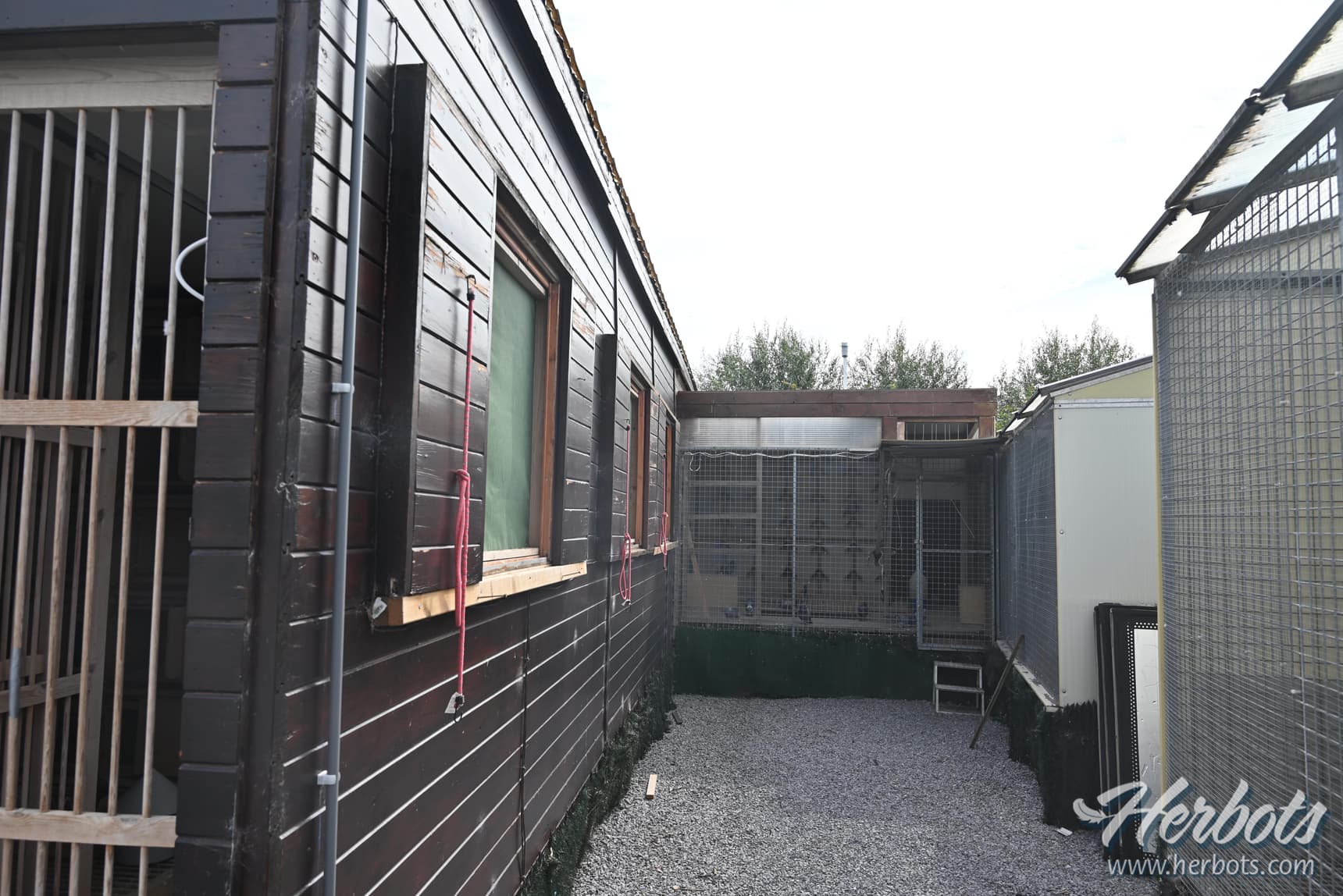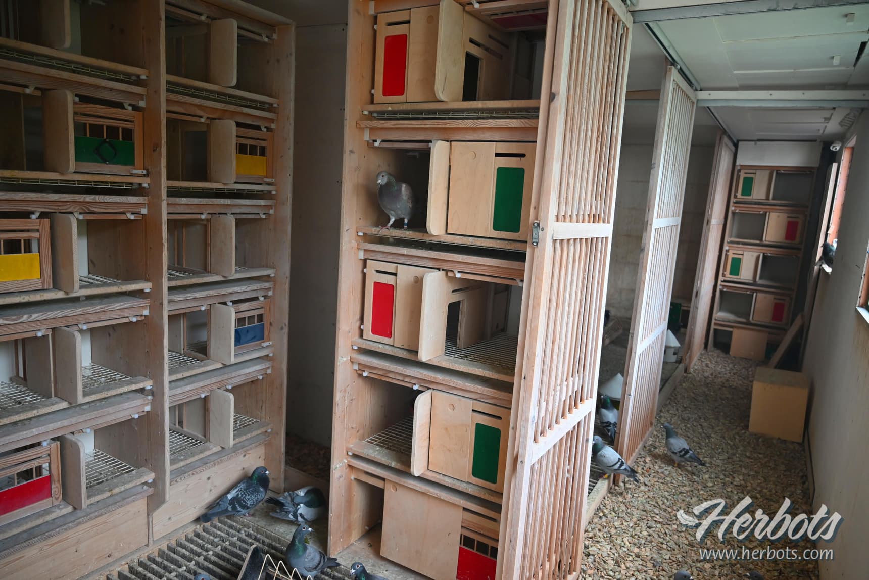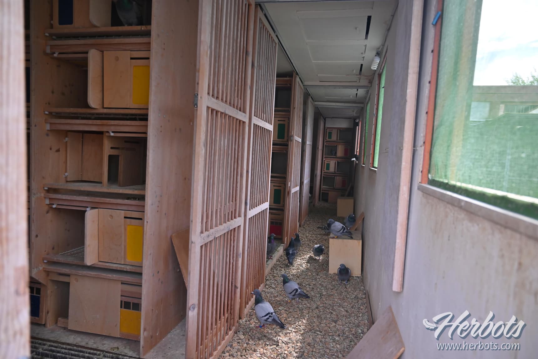 De jonge duiven huizen niet in een traditioneel duivenhok maar op een hok in een U-vorm. Het is in feite een combinatie van houten tuinhokken en volières waarbij centraal 1 ingang is.